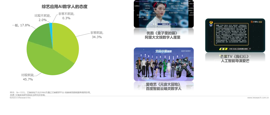 AI数字人通过提供前所未有的交互体验、虚实融合的视效奇观、以及智能化创作辅助,成功提升了综艺节目的沉浸感和吸引力,获得了极高的用户欢迎度(80%)。《盒子里的猫》节目中的厘里为明星嘉宾与虚拟角色之间的互动增添趣味和戏剧冲突;《我们仨》中的爱芒作为“人工智能导演”利用AI对海量数据进行分析处理,实时优化节目流程、环节设计、互动引导;《元音大冒险》中的“曦灵”不仅仅是屏幕上展示的虚拟形象,更实现了人(明星嘉宾)与数字人(虚拟角色)的实时深度互动。