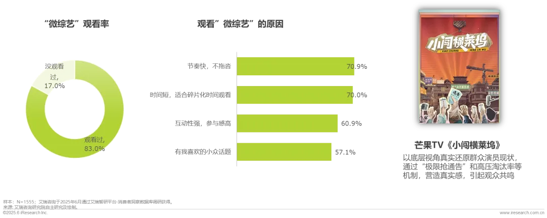 为了探索新的综艺商业模式,平台纷纷试水微综艺(如芒果TV「小Fun综」、腾讯微综艺计划)。83%的综艺用户表示观看过微综艺,微综艺具有快节奏、时间短、互动性强和题材垂直等优势。《小闯横莱坞》是芒果TV在2024年推出的一档微综艺节目,不仅开创了演综细分赛道,更通过芒果TV“小Fun综”的TO C模式,验证了“小成本+强共鸣+资源赋能” 的微综艺可行性。