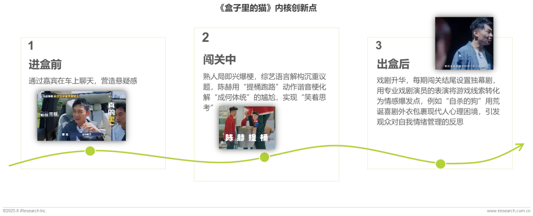 当下多数谜综侧重悬疑推理的“多巴胺刺激”,《盒子里的猫》用情感本建立差异化认知。《盒子里的猫》作为优酷2024年推出的现象级谜综,通过首创“情感本+社会议题”深度融合的内核创新模式,使观众在“爆笑-触动-沉思”的情绪链中完成对议题的内化,不仅突破了传统闯关综艺的娱乐边界,更以戏剧化表达和沉浸式叙事重构了综艺的社会价值体系。