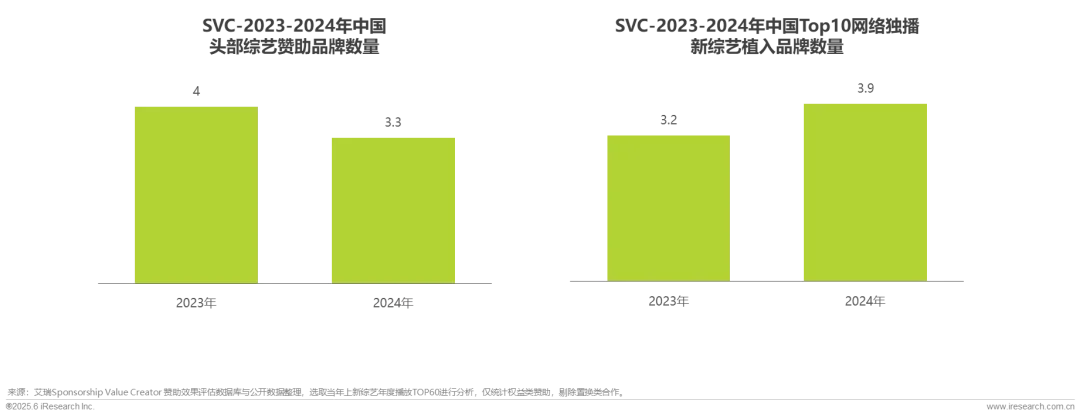 受品牌投放整体收紧影响,平均每个头部综艺赞助品牌数量略有下降;但新综艺在平台资源投入和IP创新的驱动下,广告主对其赞助意愿处于上升趋势,Top10新综艺平均植入品牌数量从2023年的3.3上升至3.9。