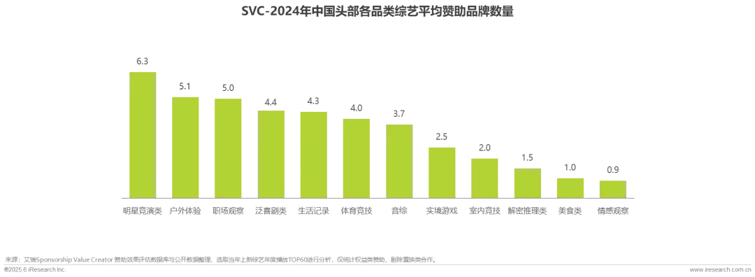 户外体验及泛喜剧类是2024年播放热度提升较大的赛道,带动了赞助植入,平均植入品牌数量也都超过4.4。