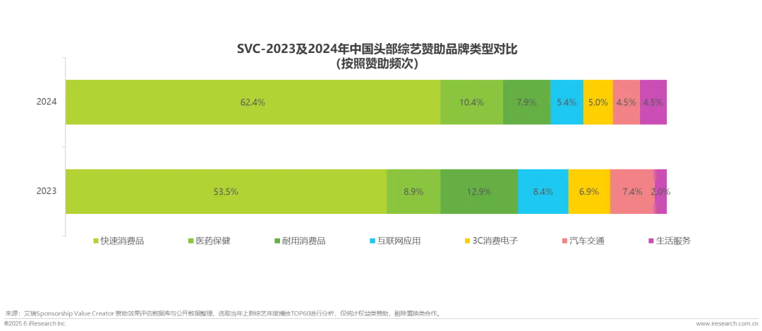 从赞助频次来看,204年快速消费品占比62.4%,且保持增长,是综艺赞助市场主要客户来源;医药保健占比10.4%,略有提升;耐用消费品和互联网应用略有下降;以通讯服务为代表的生活服务占比有较大提升,显示更多元的客户开始重视综艺赞助营销。
