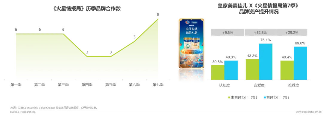 皇家美素佳儿通过植入《火星情报局第7季》收割品牌资产,品牌认知、喜爱,推荐度都有20%左右的提升,植入效果优异。