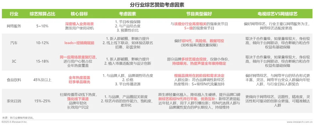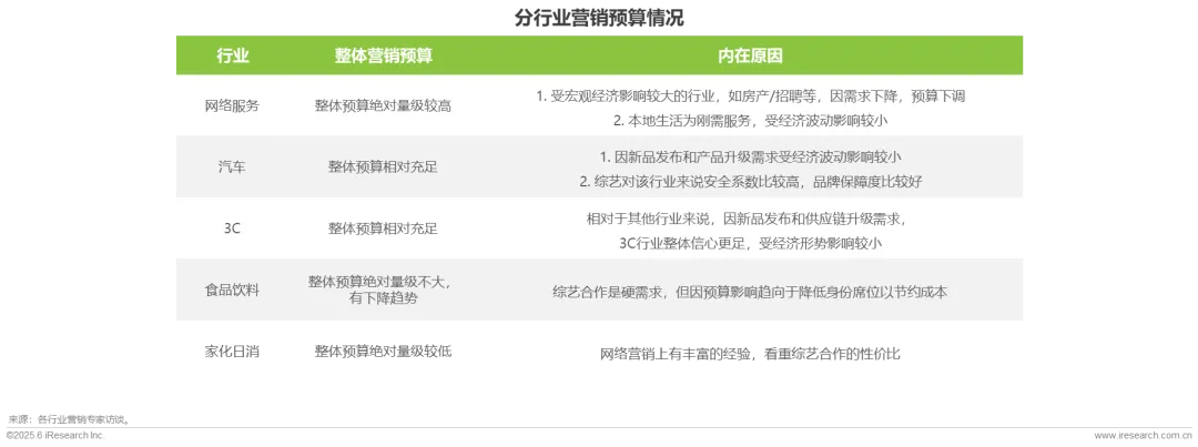 不同行业营销预算情况有所区别:网络服务行业整体营销预算规模处于较高水平,细分领域营销预算趋势分化明显;汽车行业和3C行业营销预算储备相对充足,受新产品迭代周期与技术升级需求影响预算波动较小;食品饮料行业与综艺内容合作模式成熟,但因预算下降影响趋向于降低身份席位以节约成本;家化日消行业整体预算水平较低,但网络营销经验丰富,看重合作性价比。