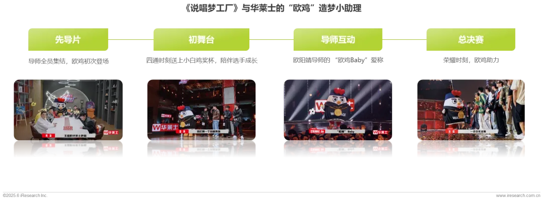华莱士通过独家冠名综艺《说唱梦工厂》,打造品牌虚拟代言人“欧鸡”(OG鸡),担任节目“造梦小助理”,身穿潮流服饰、佩戴华莱士LOGO金链,与GAI、欧阳靖等厂牌经理人互动,成功将品牌形象深度融入说唱文化,实现年轻化转型。