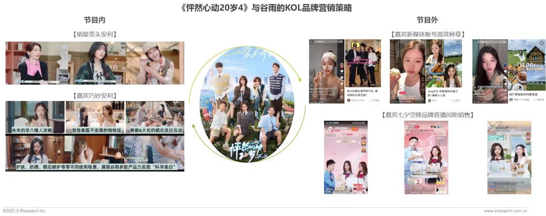 谷雨在与《怦然心动20岁4》合作期间,节目内通过明星带头安利、嘉宾场景使用等内容共创实现品牌丝滑种草;节目外通过嘉宾内容平台(小红书/抖音)种草,购物平台(淘宝/抖音/京东)直播转化,最大化品销协同。