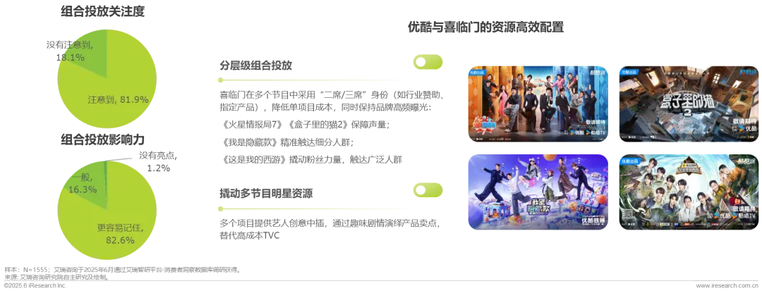 跟随市场的变化,综艺节目的招商规则也在发生相应改变。在优化资源配置的宗旨之下,综艺项目的组合售卖也越发常见,关注度高达81.9%,其中82.6%的用户表示更容易记住品牌,可持续、高频覆盖多IP,全年保持声量。例如,喜临门2025年在优酷有“火星7”“盒猫2”“隐藏款”“西游”4个项目的二席或三席身份。