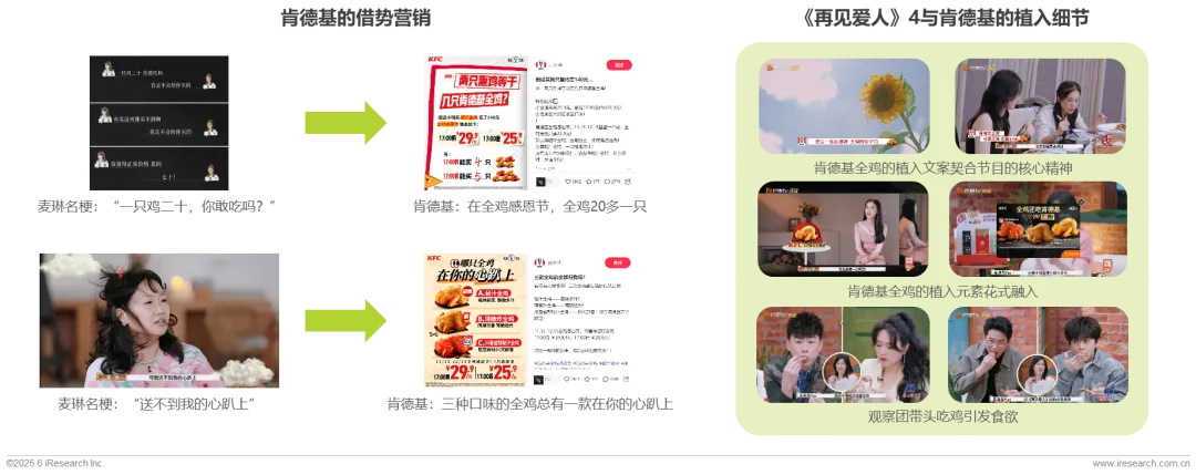 《再见爱人4》嘉宾麦琳其购买的140元熏鸡成为导火索,该事件被网友戏称为“熏鸡事变”,微博热度爆表,网友自发@肯德基赞助节目,并推出疯狂熏鸡四。肯德基快速响应,持续在微博、小红书发酵“熏鸡vs全鸡”话题,推广限时全鸡套餐。在节目中,肯德基将“全鸡”重塑为情感陪伴符号。slogan“全鸡陪你学习” 双关“爱是一生的课题”,让快餐产品承载治愈价值,消解商业突兀感。