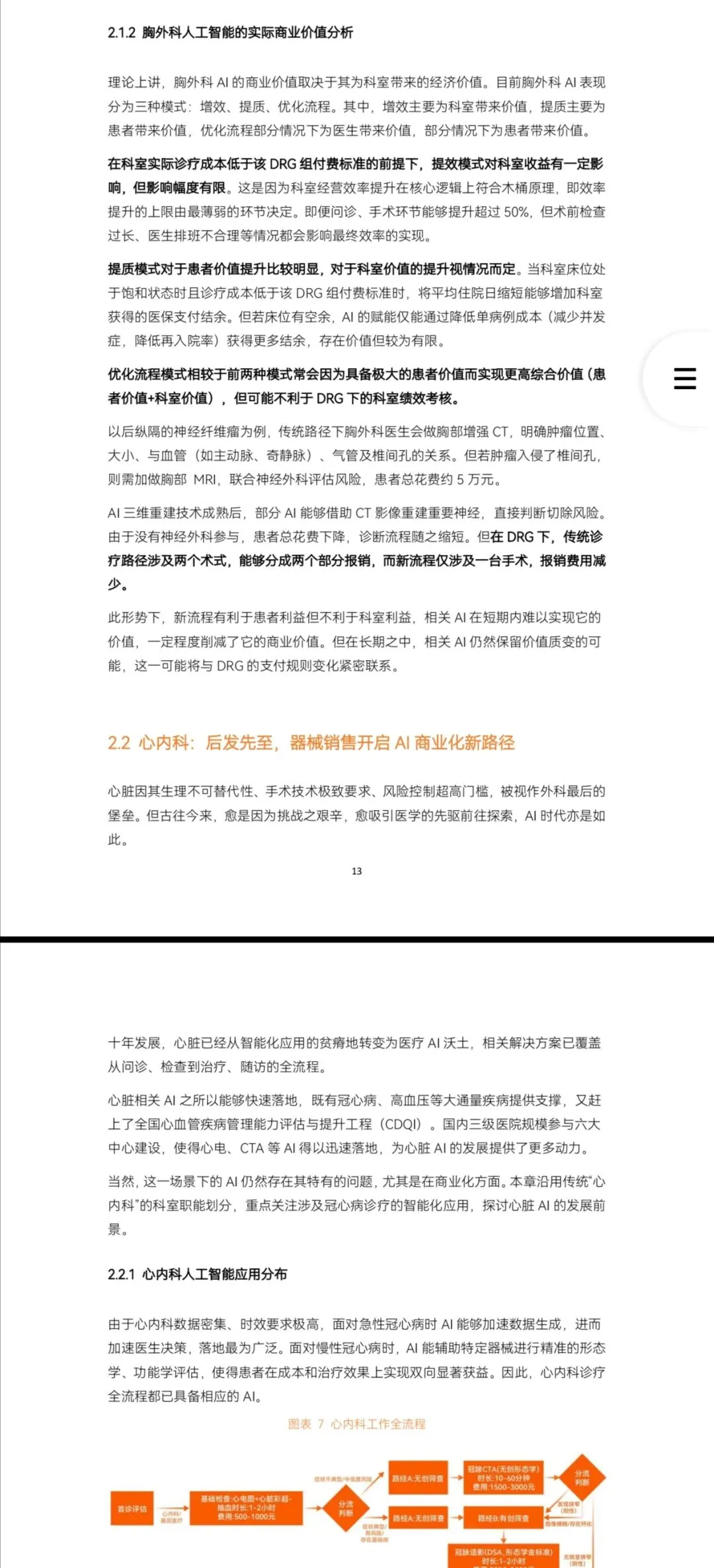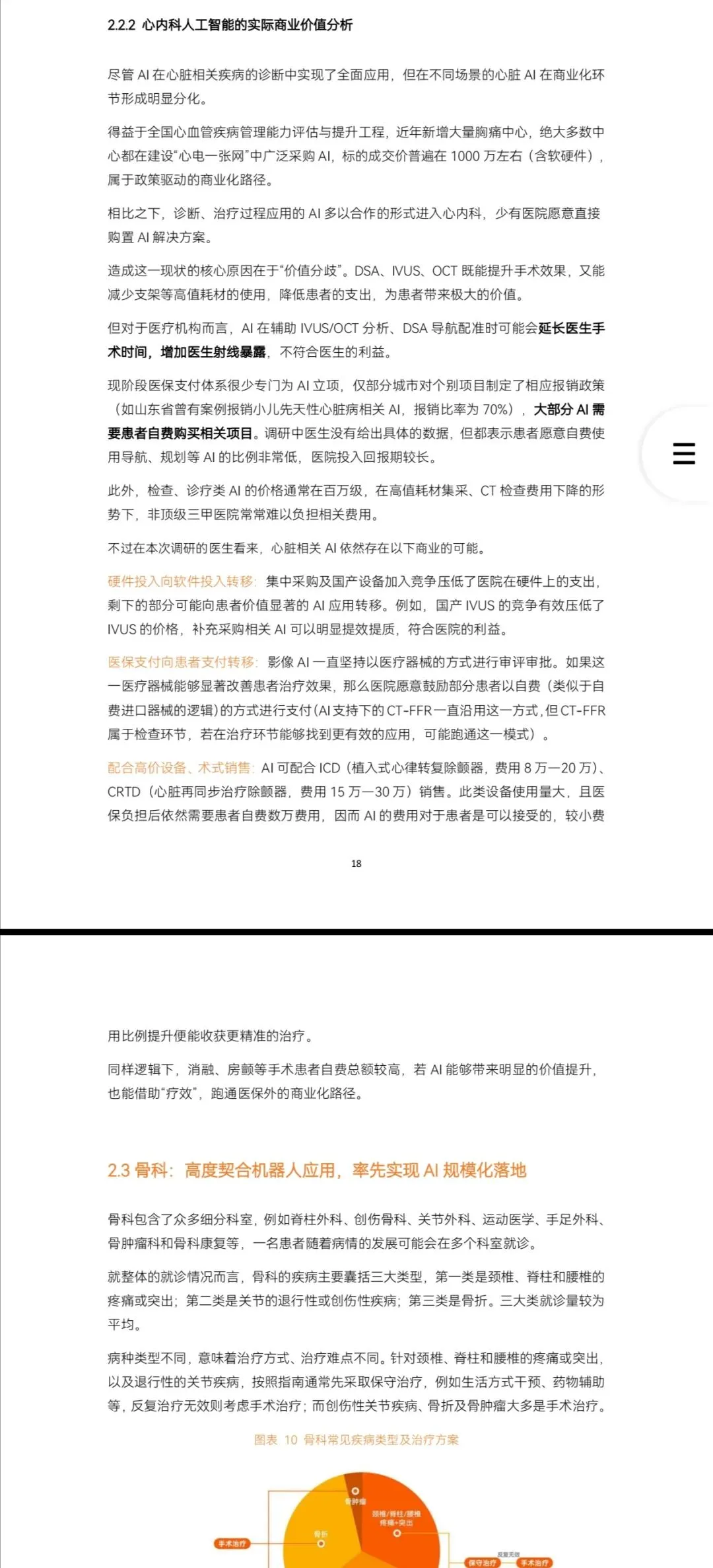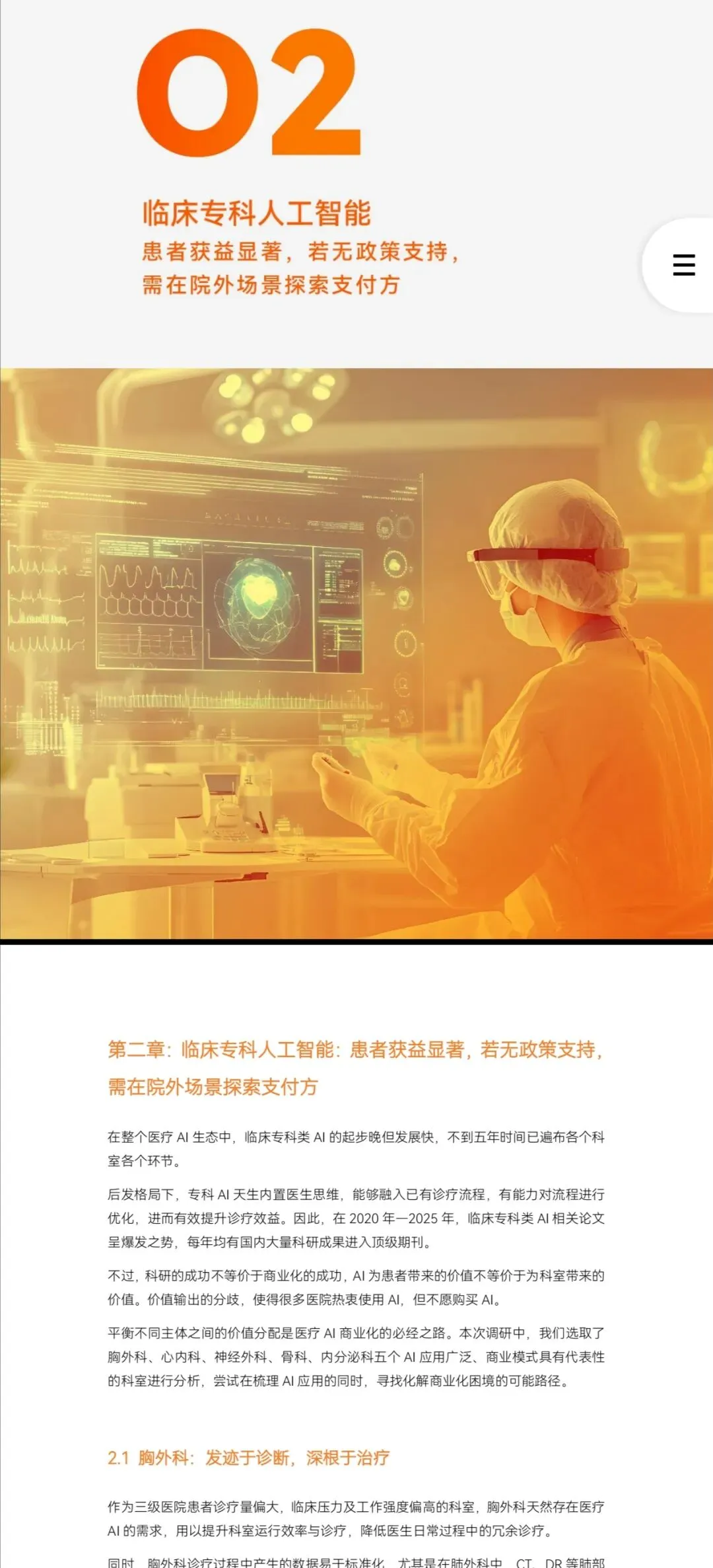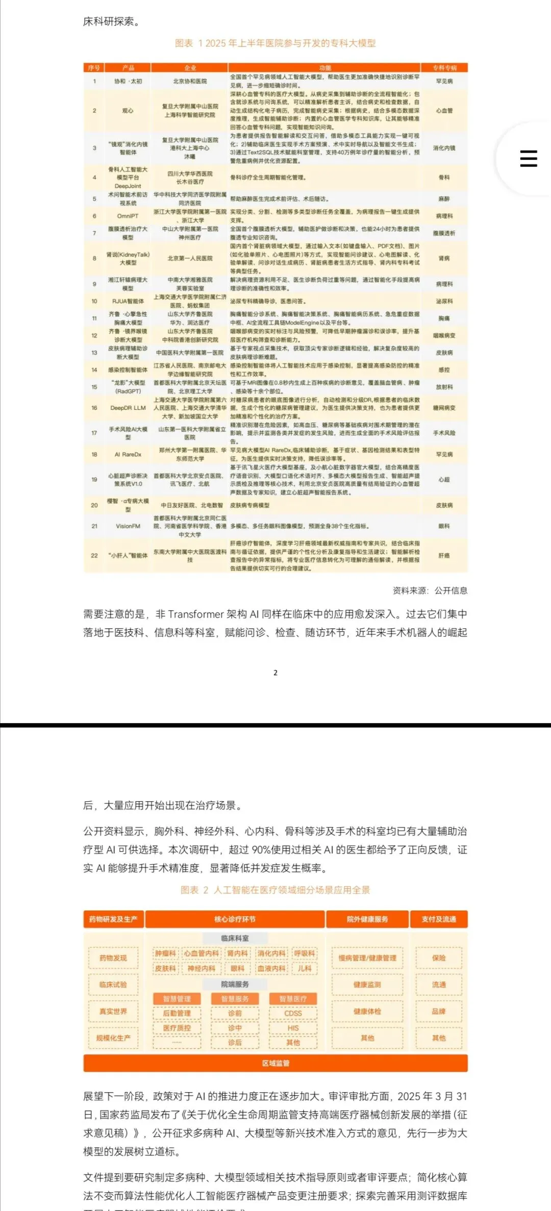 行业核心趋势清晰显现:一是大模型全面渗透,国内Top100医院已全量部署大模型,22个专科模型落地,胸外科、心内科等领域实现“单病种到多病种”“诊断到治疗”全流程覆盖;二是价值矛盾成商业化瓶颈,AI优化患者疗效与降低医疗成本的价值,与DRG支付下科室收入可能减少的现实形成冲突,导致医院付费意愿受限;三是数据资产化破局,国家数据局推动下,健康数据交易提速,可信数据空间与智能化治理技术降低研发成本,成为产业可持续增长关键;四是落地场景分化,骨科(手术机器人)、基层医疗(CDSS)率先跑通商业化,临床专科AI向院外支付探索,医技科AI强调系统原生融合。