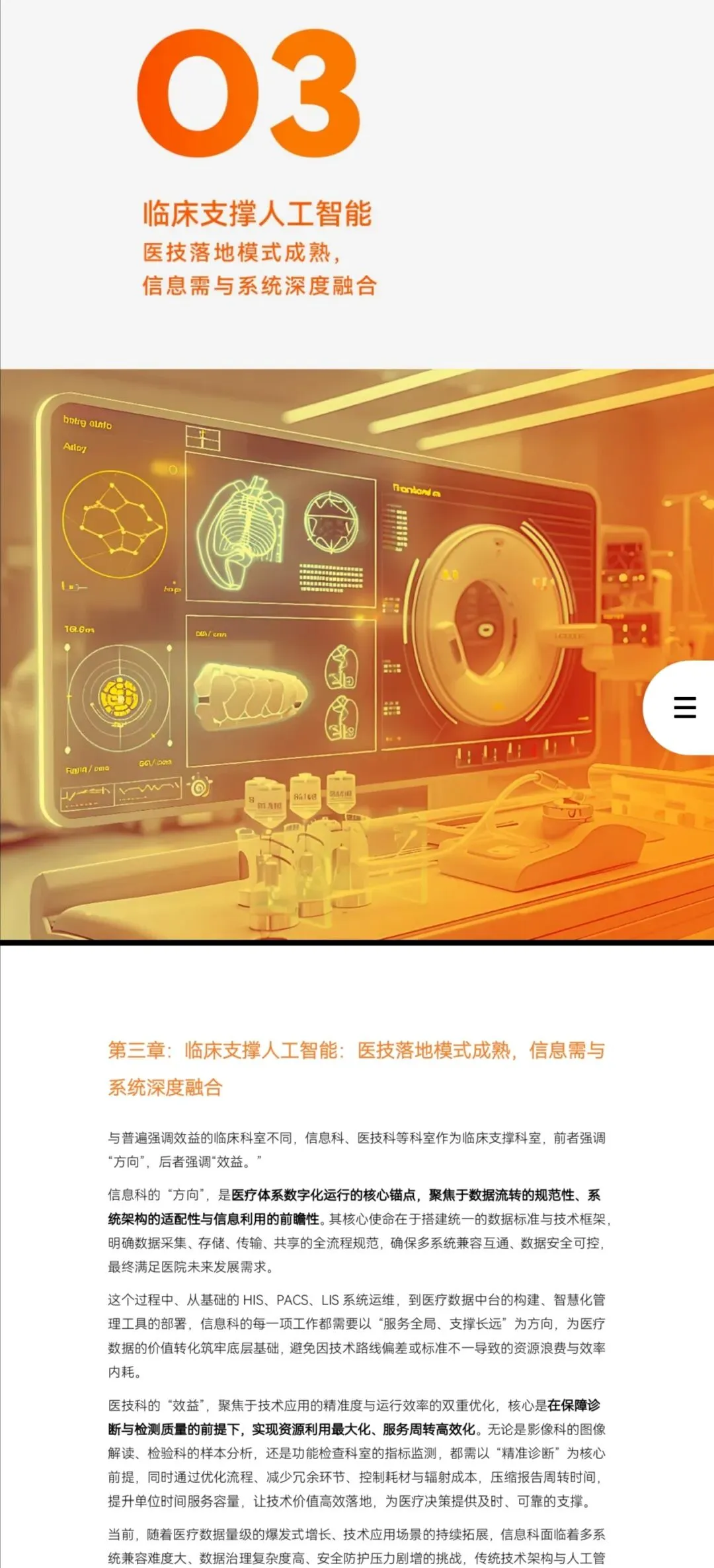 产品规划核心方向明确:临床端聚焦“治疗价值增量”,如骨科3D打印植入体、心内科SYNTAX智能评分系统,通过精准医疗创造付费理由;医技端推进原生AI融合,联影智能AI PACS实现影像处理与报告生成一体化,效率提升5-8倍;数据端强化多模态治理,水木金昇、东软等企业通过AI实现文本、影像数据标准化,缩短研发周期。