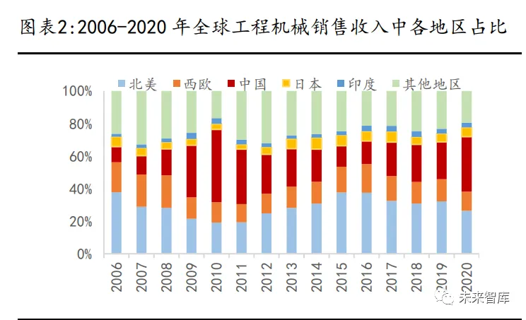 中国市场约占全球约 34%,海外市场空间广阔。从 2006-2020 年历史数据看, 中国在 2009 年金融危机后首次超于北美及欧洲,成为全球工程机械第一大市 场,此后,经历供给侧改革期间市场的萎缩,但 2017 年再度超越西欧,2020 年疫情后经济率先恢复,收入规模超越北美地区,重回全球第一大市场。不 过,海外工程机械约为国内市场规模的 2 倍,仍有广阔市场空间。 根据工程机械工业年鉴数据,2020 年全球工程机械销售收入 1013 亿美元中, 中国市场达到 341.6 亿美元,占比达到 33.7%,北美、西欧分别占比 26.4%、 11.8%,日本、印度占比 5.7%、2.9%,其他地区占比 19.5%。