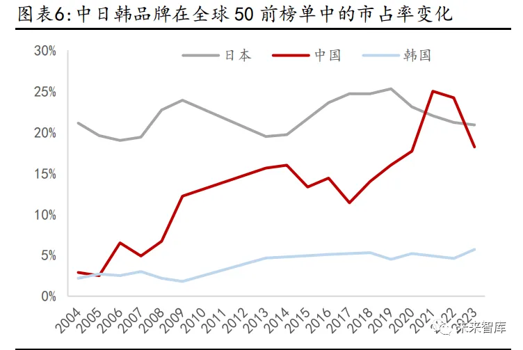 1.2.1 纵向对比:过去 20 年,以中国为代表的亚洲品牌迅速崛起,北美品牌市 占率下降