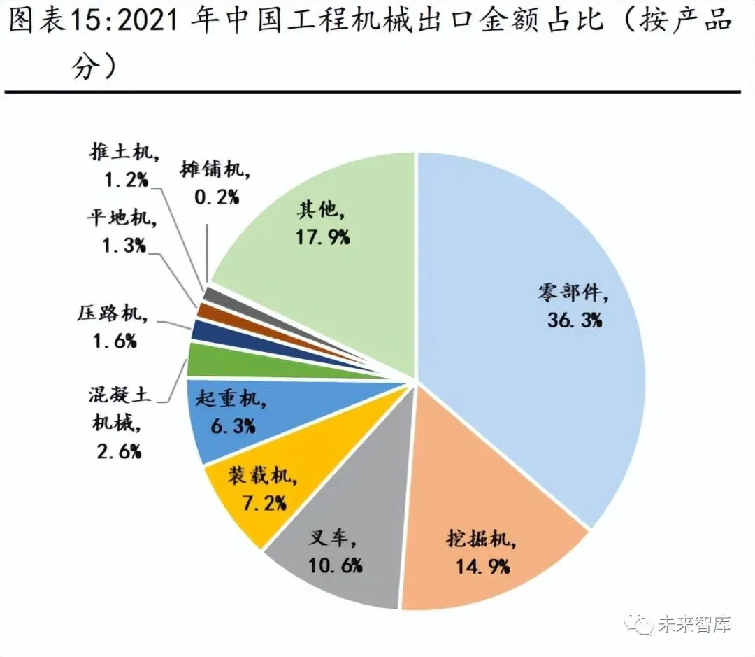 挖掘机、叉车、装载机、起重机是我国最主要出口主机产品。按产品分,2021 年中国工程机械出口 340 亿美元中,约有 36.3%来自零部件。而在十大类主机 产品中,挖掘机在出口中占据了主要地位,2021 年履带式、轮胎式及其他挖 掘机共计出口 50.7 亿美元,占工程机械总出口金额的 14.9%。叉车是工程机 械出口的第二大品种,2021 年电动、内燃叉车共计出口 35.9 亿美元,占工程 机械出口金额的 10.6%。装载机、起重机是第三、四大出口产品,分别占比 7.2%、6.3%。 出口对装载机、起重机、叉车、挖机等均有较大影响,约占总销量比重 4-6 成。从各产品出口量占总销售量比重看,装载机出口台量占总销量比重最高, 达到 57.9%,起重机出口占总销售量比重 54%,叉车、挖掘机分别为 47%、 36.5%。出口对于几大主要主机产品销售中均具有举足轻重的地位。