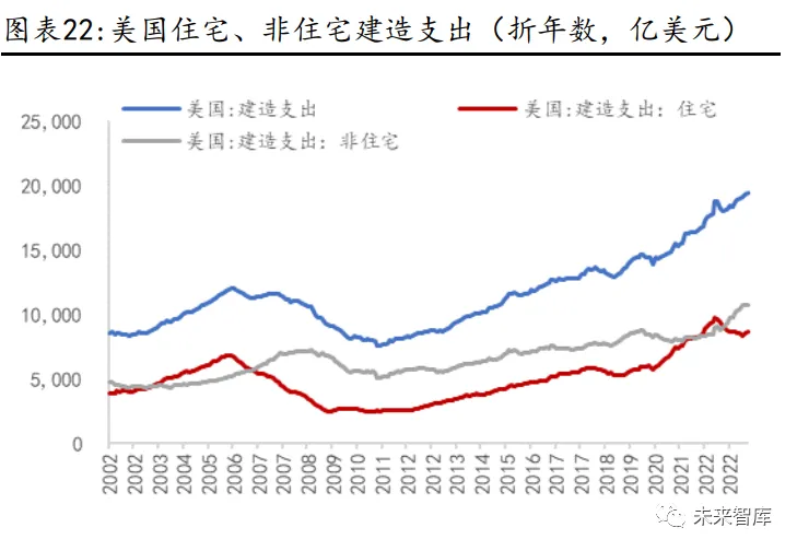 相比之下,美国住宅类建造支出放缓。二战后,经济复苏带动美国地产迅速发 展,新开工私人住宅数量超越 100 万套,1960、1969 年几次经济危机带来窄 幅波动。70 年代后,婴儿潮成年推动美国地产再次走向高峰,但随后的 1973 年、1979 年两次石油危机带来房地产市场的剧烈震荡。90 年代后 ,在宽信用 宽利率、提升住房自有率以及更宽松的移民法案等政策下,呈现了较长期大的 繁荣。直至 2008 年次贷危机,新开工数量降至冰点,但危机后地产逐年复 苏。2020 年疫情的爆发并未对私人住宅新开工带来剧烈波动,该指标在 2020- 2022 年分别为 137.9 万套、160.1 万套、155.3 万套,但增速有所放缓。