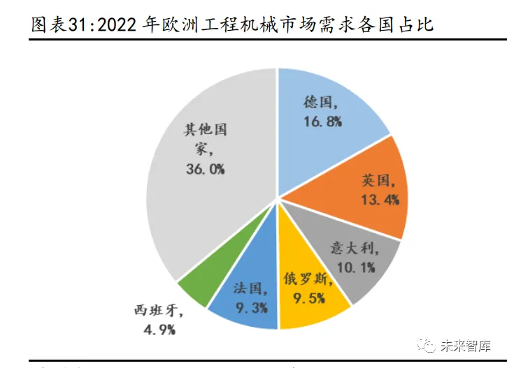 根据 Freedonia 数据,2022 年欧洲工程机械市场规模约为 535 亿美元,占据 主要市场份额的分别是德国(16.8%)、英国(13.4%)、意大利(10.1%)、俄罗 斯(9.5%)、法国(9.3%)等。 德国是欧洲最大的工程机械市场,这与德国庞大的经济体量、充分竞争的市场 环境以及出口导向型经济,以及德国庞大多样化的建筑业以及大量的存量基建 及大型建筑,以及德国对工人的保护、严格的施工标准及环境法规息息相关。 英国同样具有发达的经济,大量的存量建筑及公共基础设施,以及很大的非住 宅建筑需求,对机械化程度要求高。 另外,从区域角度划分,西欧工程机械需求占比欧洲市场近 8 成。根据 Freedonia 数据,2022 年西欧地区工程机械需求约为 421.6 亿美元,而东欧地 区需求约为 113.7 亿美元,需求规模占比分别为 79%、21%。