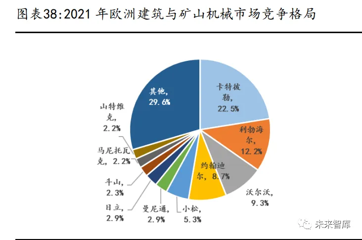 与北美市场相同的是,欧洲建筑与矿山机械市场同样高度集中,根据 Frost& Sullivan 数据,建筑与矿山机械 CR3 约为 44%,CR5 约为 53.2%,前三大供应 商分别是美国的卡特彼勒(22.5%)、德国利勃海尔(12.2%)、瑞典的沃尔沃建 筑(9.3%)。处于第二梯队的分别是美国约翰迪尔、日本小松、法国曼尼通。