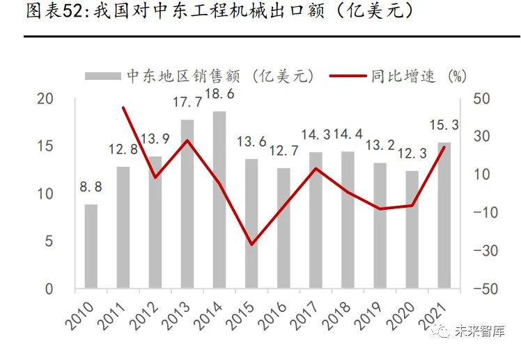 2021 年,我国对中东地区出口工程机械金额约为 15.3 亿美元,增速达 15.3%。沙特、阿联酋是我国工程机械出口到中东地区的主要国家,出口占比 显著高于该地区其他国家。据前瞻经济学人统计,2022 年 1-11 月,我国对沙 特工程机械出口额 7.66 亿美元,同比增长 109.5%。