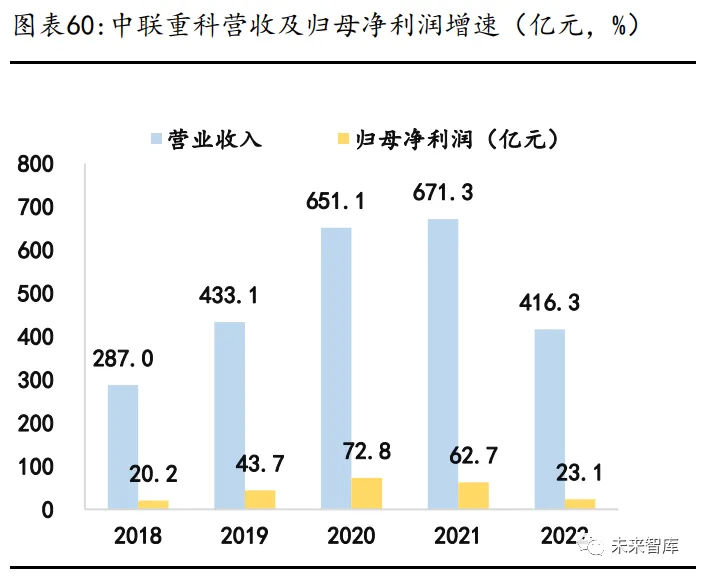 中联重科股份有限公司成立于 1999 年,主营业务是工程机械和农业机械的研 发、制造、销售和服务。公司的主要产品是混凝土机械、起重机械、土石方施 工机械、桩工机械、高空作业机械、消防机械、矿山机械、叉车、耕作机械、 收获机械、烘干机械、农业机具、金融服务。 2022 年,公司实现营收 416.3 亿元,归母净利润 23.1 亿元,销售毛利率 21.8%,销售净利率 5.7%。从业务构成看,2022 年公司起重机械实现营收 189.8 亿元,其中,混凝土机械类 84.6 亿元,占比 20.3%;高空机械 46 亿 元,占比 11%;土方机械 35.1 亿元,占比 8.4%。分地区看,2022 年国外营业 收入 99.9 亿元,占总收入 24%,同比增长 72.6%。2023H1,公司实现国外营业 收入 83.7 亿元,占总收入 34.8%,同比增长 115.4%。