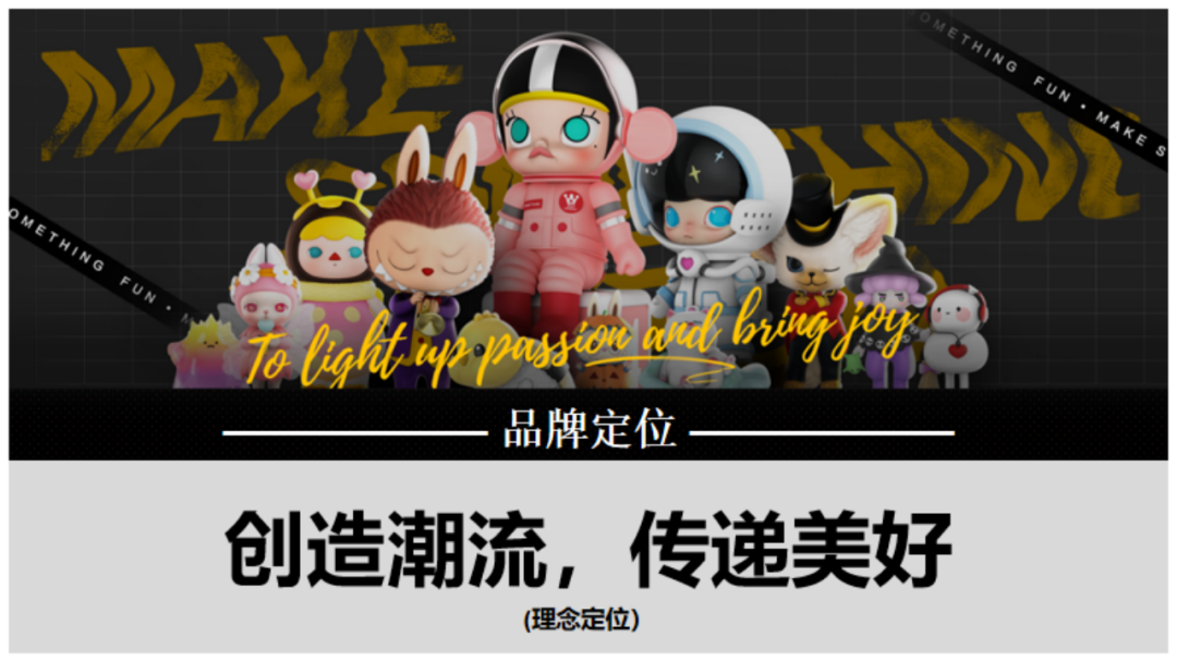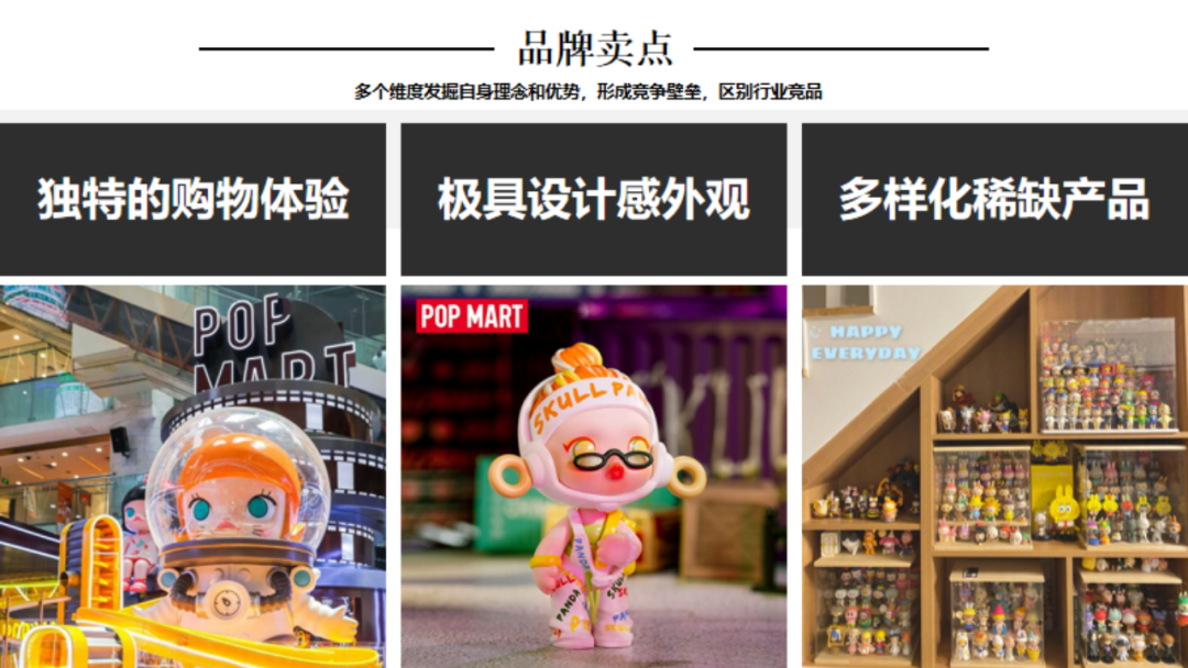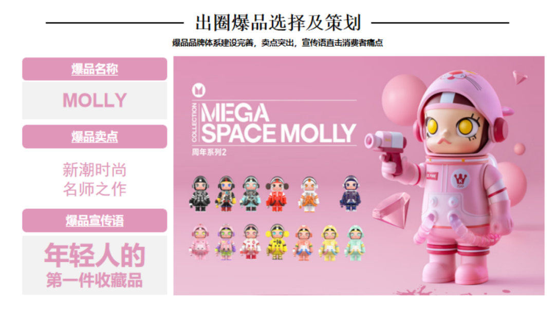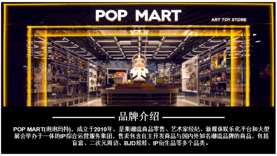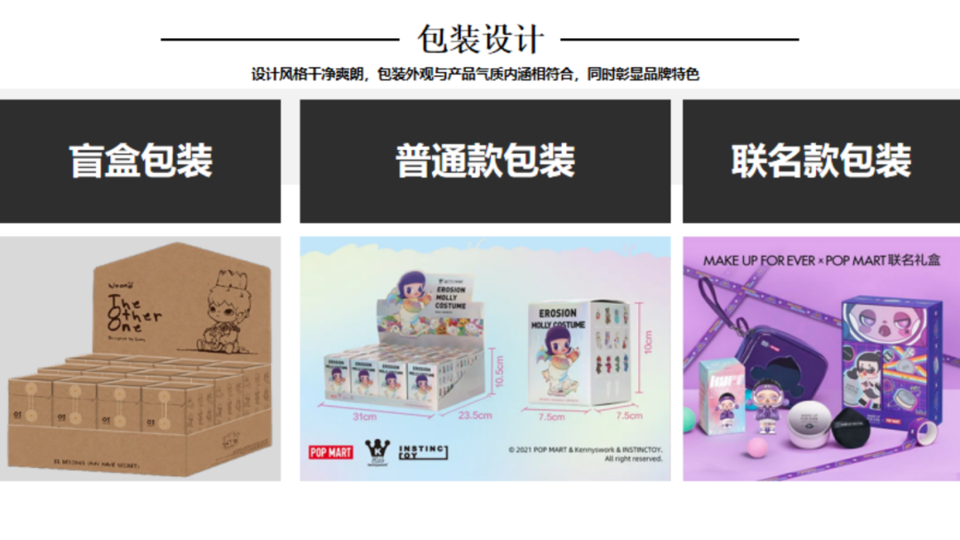 引言:1980年12月中央电视台引进第一部日本动画片《铁臂阿童木》,自此日本动漫及其配称产业正式进入了中国市场。随着四十多年的改革开放推进,我国的潮流手办、IP等文化产业已具备相当规模,以拥有较高的产业集中度以及消费认知。那么行舟品牌咨询大定位研习,今天就带大家一起研习潮流手办头部品牌——泡泡玛特品牌介绍:POP MART(泡泡玛特),成立于2010年,是集潮流商品零售、艺术家经纪、新媒体娱乐化平台和大型展会举办于一体的IP综合运营服务集团,售卖包含自主开发商品与国内外知名潮流品牌的商品,包括盲盒、二次元周边、BJD娃娃、IP衍生品等多个品类。发展十余年来,POP MART泡泡玛特围绕全球艺术家挖掘、IP孵化运营、消费者触达、潮玩文化推广、创新业务孵化与投资五个领域,构建了覆盖潮流玩具全产业链的综合运营平台一、战略层1、顶层战略首先,顶层设计对于品牌的发展至关重要。在一家企业中,如果没有一个长远的规划和细致的执行,那么品牌的发展将会一片混乱。企业需要明确自身定位、目标市场、品牌理念等信息,这些信息对品牌的发展非常关键。那么泡泡玛特的顶层战略是怎样的呢!首先来看泡泡玛特的品牌定位,泡泡玛特采用自身的品牌理念——创造潮流、传递美好作为自身的品牌定位。以创造潮流作,传递美好作为自身品牌理念,展示出泡泡玛特年轻化的品牌调性,新颖、潮流的姿态。那么我们可以说泡泡玛特是基于产品属性、以及受众情况界定了自身的品牌定位。在市场定位方面泡泡玛特以“15-30岁都市女性”作为自身的市场定位品特性以及消费者需求等多方面考量,泡泡玛特定位女性为主要消费客群。一方面是基于产品属性的考量,另一方面是对当下市场购买力的把握,女性消费人群的购买力一直处于绝对的强势地位,而且15-30岁女性对潮流消费的水平更是不容小觑。由此看来泡泡玛特的品牌及市场定位处处充满着智慧与考量。再来看看泡泡玛特的品类战略。选择好合适的品类对于企业和品牌来说是关乎未来发展的重要布局。泡泡玛特作为潮流时尚品牌,选择手办切入年轻人市场。手办是什么?手办是兼具空间装饰和社会亚文化内涵的时尚消费品。在该品类下聚集着一大批强势品牌,诸如:日本的万代、丹麦的乐高等,还有一些有些制作工厂是较为出名的强势品牌有多啦爱梦、迪士尼等等。但是这些都是较为传统是手办制作品牌,其主线业务多数并不在此。泡泡玛特的差异化之处就在于将手办与时尚潮流相结合,创造出专属于泡泡玛特的潮流手办文化。在竞争战略层面,泡泡玛特以挑战者的姿态进入手办市场,立足于潮流手办行业,做潮流手办挑战者,连续超越万代和乐高等品牌成为手办行业头部。2、品牌战略泡泡玛特在品牌战略方面拥有完善的识别体系。作为潮流手办挑战与创新者,泡泡玛特走年轻潮流路线建设品牌识别体系,提升整体认知度。以潮流、年轻的品牌个性为客户提供个性化时尚手办。在品牌卖点等方面泡泡玛特从多个维度发掘自身理念和优势,形成竞争壁垒,区别行业竞品。包括了精选独特的购物体验、极具设计感外观、多样化稀缺产品等方面。泡泡玛特的品牌口号是“创造潮流,分享美好”极富自由主流色彩的开放包容口号,拉近了消费者与品牌之间的情感距离。3、产品战略从产品层面来看,泡泡玛特的产品线布局是以旗舰产品Molly为核心,并不断拓展其它IP形象而展开的产品线。并且包含了PUCKY、LABUBU、DIMOO等。在此之上,泡泡玛特还进行了完善的品牌体系建设包括:超级形象产品MEGA SPACE MOLLY、普通流量产品Molly卡贴、核心利润产品Molly、个性需求产品Molly手机壳等。完善的SACX体系规划有利于品牌在产品竞争上建立应对市场变化的压力。泡泡玛特的出圈爆品是“Molly”这款产品其卖点沿用品牌卖点,打出了“新潮时尚,名师之作”的口号直击消费者痛点。二、视觉层泡泡玛特采用红色作为自身的品牌色,但并不强调大片的红来张扬自身的品牌个性,反而采用有潮流感酷酷的黑和一些黄作为使用色调。我们来分析一下泡泡玛特所采用的三个色调:红色、黑色和黄色。我们可以认为红色和黄色的暖色调是市场消费导向暖色会提升消费者好感度,黑色调又可张扬品牌个性这是MI充分表现得标杆案例。在logo设计上简朴的质感铺面而来,红色背景加上品牌名的搭配其简洁性犹如产品所要表达的一样干净简洁。在kv设计上依旧沿用品牌保持的调性,简洁明亮、色彩搭配和谐、画面冲击感强烈。其官网设计亦是如此。包装设计上泡泡玛特大体上采取三类不同的包装设计,分别是盲盒款,普通款和联名款其特色各不相同。三、营销层泡泡玛特的营销层面建设是非常完善的,从媒体布局情况来看,泡泡玛特拥有包括抖音、小红书、微博、微信公众号等几大营销阵地。其媒体建设包含了、直播带货、话题营造、代言人官宣、节日营销、活动发布等功能。在品牌EPR建设方面好泡泡玛特品牌渠道广泛,声量大,认知度高,口碑也较好。说一说具体的营销层面,最令泡泡玛特出圈的是盲盒模式的“饥饿营销”,在制造饥饿层面泡泡玛特的基础原则是同系列产品多样化,盲盒模式种夹杂隐藏款、典藏款等“小惊喜”。这给不断猎奇的消费者以具大诱惑,不断刺激消费者消费在终端建设这方面,泡泡玛特布局了天猫、京