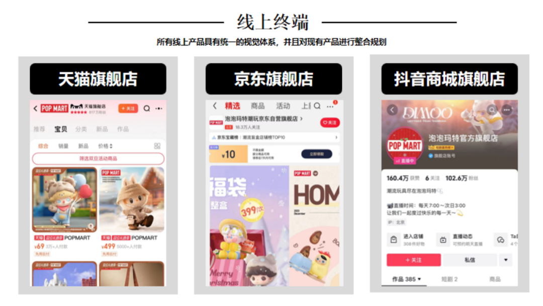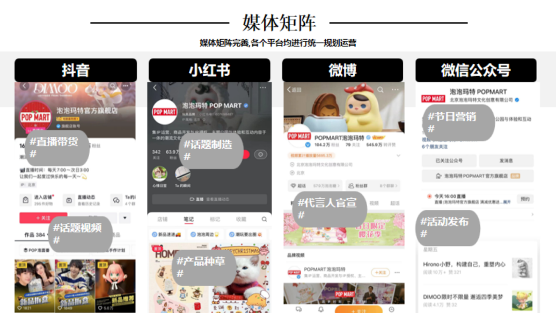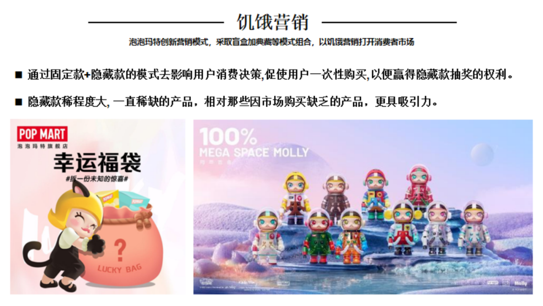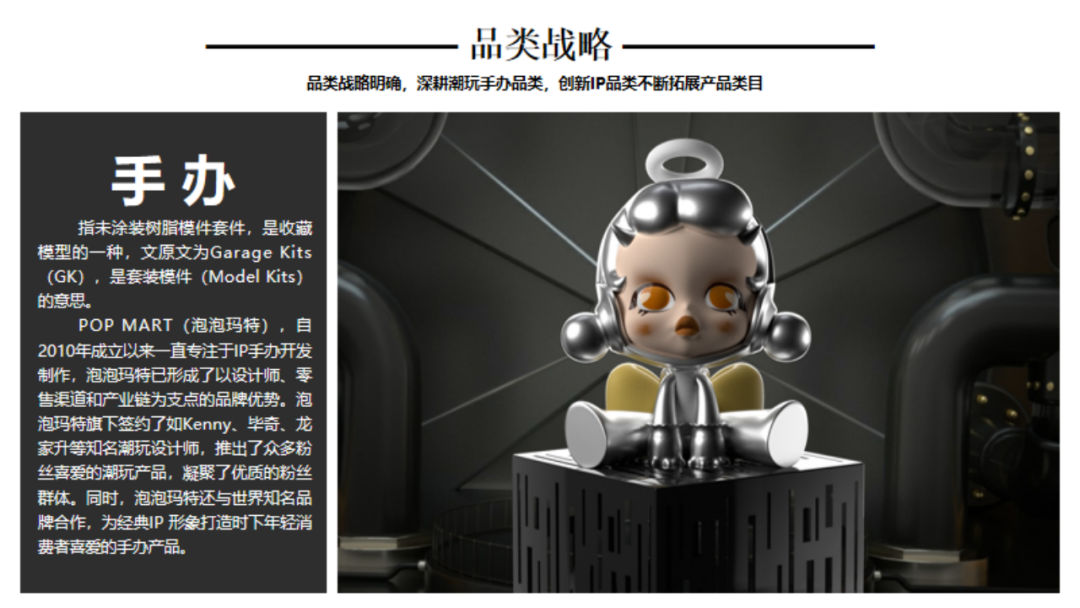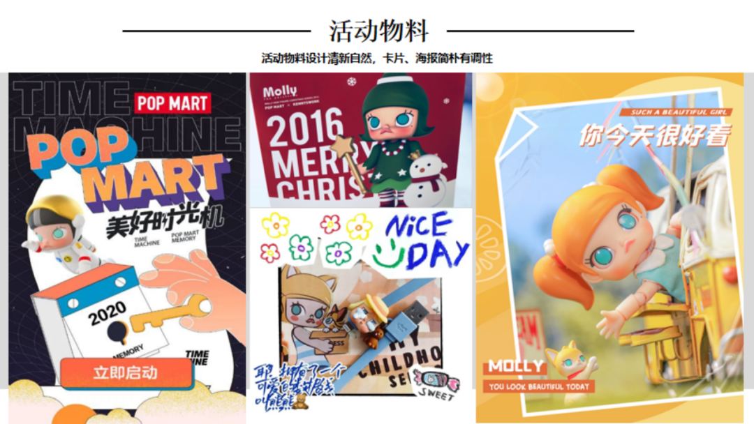 引言:1980年12月中央电视台引进第一部日本动画片《铁臂阿童木》,自此日本动漫及其配称产业正式进入了中国市场。随着四十多年的改革开放推进,我国的潮流手办、IP等文化产业已具备相当规模,以拥有较高的产业集中度以及消费认知。那么行舟品牌咨询大定位研习,今天就带大家一起研习潮流手办头部品牌——泡泡玛特品牌介绍:POP MART(泡泡玛特),成立于2010年,是集潮流商品零售、艺术家经纪、新媒体娱乐化平台和大型展会举办于一体的IP综合运营服务集团,售卖包含自主开发商品与国内外知名潮流品牌的商品,包括盲盒、二次元周边、BJD娃娃、IP衍生品等多个品类。发展十余年来,POP MART泡泡玛特围绕全球艺术家挖掘、IP孵化运营、消费者触达、潮玩文化推广、创新业务孵化与投资五个领域,构建了覆盖潮流玩具全产业链的综合运营平台一、战略层1、顶层战略首先,顶层设计对于品牌的发展至关重要。在一家企业中,如果没有一个长远的规划和细致的执行,那么品牌的发展将会一片混乱。企业需要明确自身定位、目标市场、品牌理念等信息,这些信息对品牌的发展非常关键。那么泡泡玛特的顶层战略是怎样的呢!首先来看泡泡玛特的品牌定位,泡泡玛特采用自身的品牌理念——创造潮流、传递美好作为自身的品牌定位。以创造潮流作,传递美好作为自身品牌理念,展示出泡泡玛特年轻化的品牌调性,新颖、潮流的姿态。那么我们可以说泡泡玛特是基于产品属性、以及受众情况界定了自身的品牌定位。在市场定位方面泡泡玛特以“15-30岁都市女性”作为自身的市场定位品特性以及消费者需求等多方面考量,泡泡玛特定位女性为主要消费客群。一方面是基于产品属性的考量,另一方面是对当下市场购买力的把握,女性消费人群的购买力一直处于绝对的强势地位,而且15-30岁女性对潮流消费的水平更是不容小觑。由此看来泡泡玛特的品牌及市场定位处处充满着智慧与考量。再来看看泡泡玛特的品类战略。选择好合适的品类对于企业和品牌来说是关乎未来发展的重要布局。泡泡玛特作为潮流时尚品牌,选择手办切入年轻人市场。手办是什么?手办是兼具空间装饰和社会亚文化内涵的时尚消费品。在该品类下聚集着一大批强势品牌,诸如:日本的万代、丹麦的乐高等,还有一些有些制作工厂是较为出名的强势品牌有多啦爱梦、迪士尼等等。但是这些都是较为传统是手办制作品牌,其主线业务多数并不在此。泡泡玛特的差异化之处就在于将手办与时尚潮流相结合,创造出专属于泡泡玛特的潮流手办文化。在竞争战略层面,泡泡玛特以挑战者的姿态进入手办市场,立足于潮流手办行业,做潮流手办挑战者,连续超越万代和乐高等品牌成为手办行业头部。2、品牌战略泡泡玛特在品牌战略方面拥有完善的识别体系。作为潮流手办挑战与创新者,泡泡玛特走年轻潮流路线建设品牌识别体系,提升整体认知度。以潮流、年轻的品牌个性为客户提供个性化时尚手办。在品牌卖点等方面泡泡玛特从多个维度发掘自身理念和优势,形成竞争壁垒,区别行业竞品。包括了精选独特的购物体验、极具设计感外观、多样化稀缺产品等方面。泡泡玛特的品牌口号是“创造潮流,分享美好”极富自由主流色彩的开放包容口号,拉近了消费者与品牌之间的情感距离。3、产品战略从产品层面来看,泡泡玛特的产品线布局是以旗舰产品Molly为核心,并不断拓展其它IP形象而展开的产品线。并且包含了PUCKY、LABUBU、DIMOO等。在此之上,泡泡玛特还进行了完善的品牌体系建设包括:超级形象产品MEGA SPACE MOLLY、普通流量产品Molly卡贴、核心利润产品Molly、个性需求产品Molly手机壳等。完善的SACX体系规划有利于品牌在产品竞争上建立应对市场变化的压力。泡泡玛特的出圈爆品是“Molly”这款产品其卖点沿用品牌卖点,打出了“新潮时尚,名师之作”的口号直击消费者痛点。二、视觉层泡泡玛特采用红色作为自身的品牌色,但并不强调大片的红来张扬自身的品牌个性,反而采用有潮流感酷酷的黑和一些黄作为使用色调。我们来分析一下泡泡玛特所采用的三个色调:红色、黑色和黄色。我们可以认为红色和黄色的暖色调是市场消费导向暖色会提升消费者好感度,黑色调又可张扬品牌个性这是MI充分表现得标杆案例。在logo设计上简朴的质感铺面而来,红色背景加上品牌名的搭配其简洁性犹如产品所要表达的一样干净简洁。在kv设计上依旧沿用品牌保持的调性,简洁明亮、色彩搭配和谐、画面冲击感强烈。其官网设计亦是如此。包装设计上泡泡玛特大体上采取三类不同的包装设计,分别是盲盒款,普通款和联名款其特色各不相同。三、营销层泡泡玛特的营销层面建设是非常完善的,从媒体布局情况来看,泡泡玛特拥有包括抖音、小红书、微博、微信公众号等几大营销阵地。其媒体建设包含了、直播带货、话题营造、代言人官宣、节日营销、活动发布等功能。在品牌EPR建设方面好泡泡玛特品牌渠道广泛,声量大,认知度高,口碑也较好。说一说具体的营销层面,最令泡泡玛特出圈的是盲盒模式的“饥饿营销”,在制造饥饿层面泡泡玛特的基础原则是同系列产品多样化,盲盒模式种夹杂隐藏款、典藏款等“小惊喜”。这给不断猎奇的消费者以具大诱惑,不断刺激消费者消费在终端建设这方面,泡泡玛特布局了天猫、京