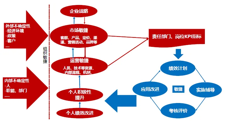 敏捷绩效属于运营敏捷的范畴。通过绩效管理的实施可以对组织及组织内部的个体市场经营活动、运营管理活动的执行过程及结果进行监督、评价,绩效实施过程中的沟通辅导就是对日常经营管理活动的执行辅导,包括方向的把控、资源的评估、进度的管理等,评价结果则可作为管理持续优化的依据,做的好的继续巩固强化和优化,不足的寻找差距、找原因、定策略、及时改进。绩效管理是支撑战略落地的有效工具,是经营管理的“指挥棒”,敏捷绩效管理对于组织敏捷能力的打造具有积极的促进作用。
