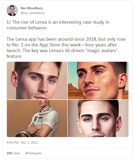 1/ Lensa的兴起可以作为消费者行为的一个有趣的案例研究:Lensa app其实早在 2018 就有了,但在推出四年之后的本周才升至应用商店的第一名。关键是Lensa 推出了AI 驱动的“魔法化身”功能。