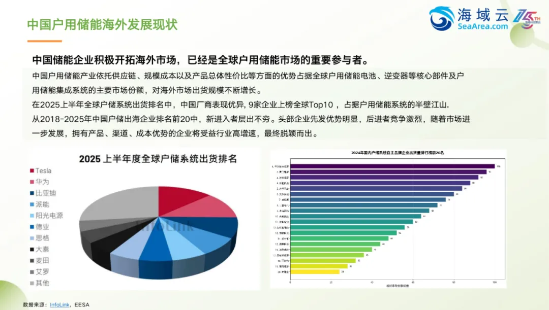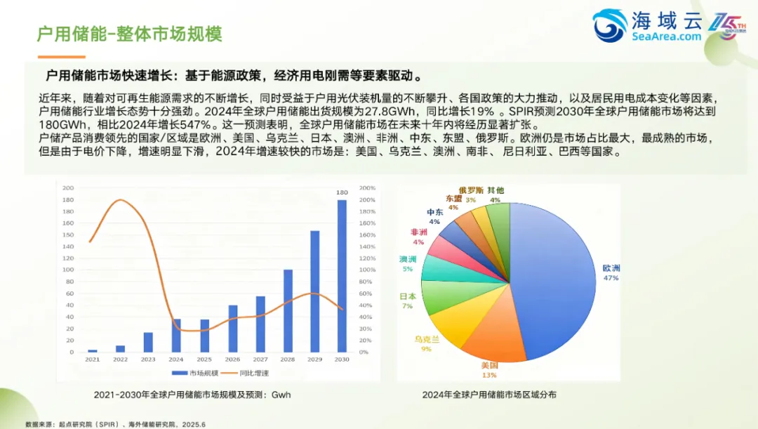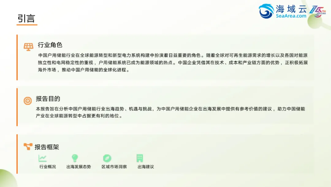中国户用储能行业在全球能源转型和新型电力系统建设中发挥着越来越重要的作用。随着各国对可再生能源的重视以及对能源独立性和电网稳定性的追求,户用储能系统逐渐成为能源领域的重要组成部分。中国企业凭借在技术、成本和产业链方面的优势,正加快步伐进入国际市场,推动户用储能产业的全球化发展。报告聚焦于中国户用储能企业出海的趋势、机遇与挑战,旨在为相关企业提供切实可行的发展建议,助力其在全球能源结构变革中占据更有利的位置。从行业分类来看,储能技术广泛应用于电力系统的不同环节,包括电源侧、电网侧和用户侧。其中,用户侧储能涵盖家庭、商业及工业场景,根据容量大小可分为户用、便携式及工商业储能。户用储能以小型化、适配家庭用电需求为主,强调自主供电能力和成本控制;而工商业储能则更注重规模效益与系统稳定性。便携式储能则主要用于户外移动场景,具备灵活、轻便的特点。在实际应用中,不同类型储能系统承担着不同的功能。电源侧储能主要用于平衡新能源发电波动,提升电网运行效率;电网侧储能则侧重于优化电力传输、提高电能质量;用户侧储能则更关注于降低用电成本、提升供电可靠性。各类储能设备在设计上也各有侧重,如电源侧设备强调高功率与快速响应能力,户用设备则更注重安全性和实用性。中国户用储能行业正处于快速发展阶段,市场需求持续增长,技术不断迭代,产品形态日益丰富。如何在国际市场上找准定位、应对政策差异、优化供应链布局,将成为企业出海的关键课题。