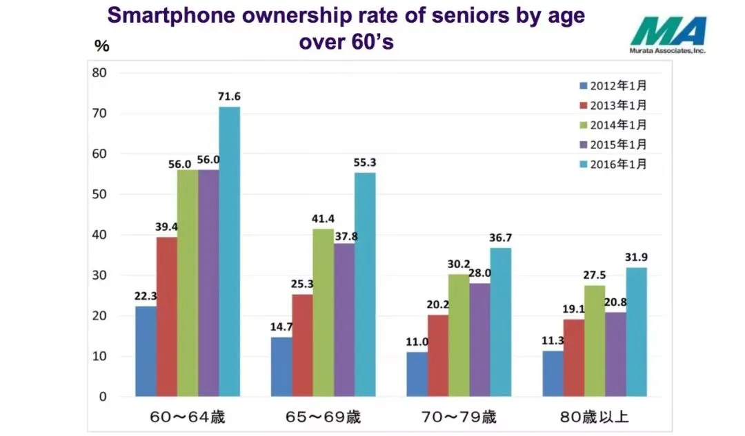 日本老年智能手机市场也保持着迅速普及趋势,智能手机在老年群体中的渗透率,2016年比2015年增长十几个百分点,总体渗透率已经超过60%,而国内不到25%,增长空间还很大。