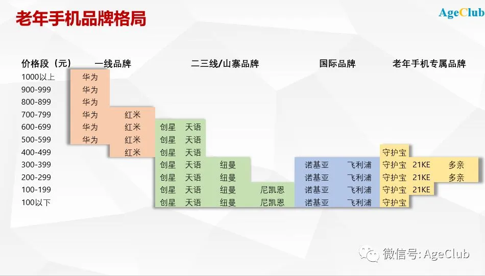 AgeClub将老年手机市场划分为四类品牌,第一类是华为、小米(红米)等头部智能手机品牌,他们是头部品牌中率先扎进老年手机市场的,覆盖四五百元至千元以上的智能机。