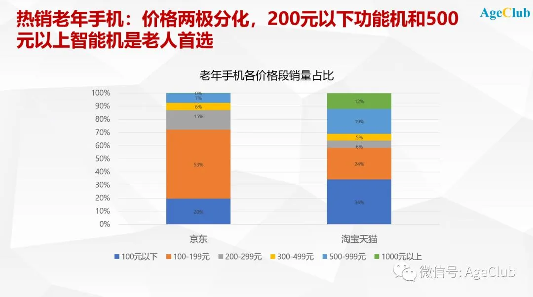 为了研究中老年电子消费市场,AgeClub新老年商业研究院统计了1.5万条来自头部电商平台的老年手机消费数据,从十几个不同数据维度分析老年手机市场的品牌格局、价格分布、功能特征和发展方向: