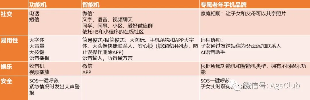 AgeClub将老年用户对手机的需求细分为四大类——社交、易用性、娱乐、安全,在社交、易用性和娱乐上,智能机全面超越功能机。