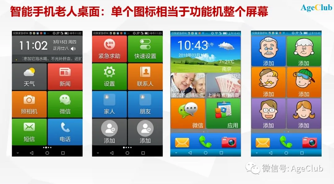 AgeClub认为,需要区分老人需求的不同场景,在紧急场景,智能手机和各种手环、手表等可穿戴设备一样,起到监测突发状况、第一时间呼救的作用;在日常场景,智能手机由于其平台性、开放性,可以安装各种软件、链接各种设备,事实上可以而且应该成为老人的健康生活入口。