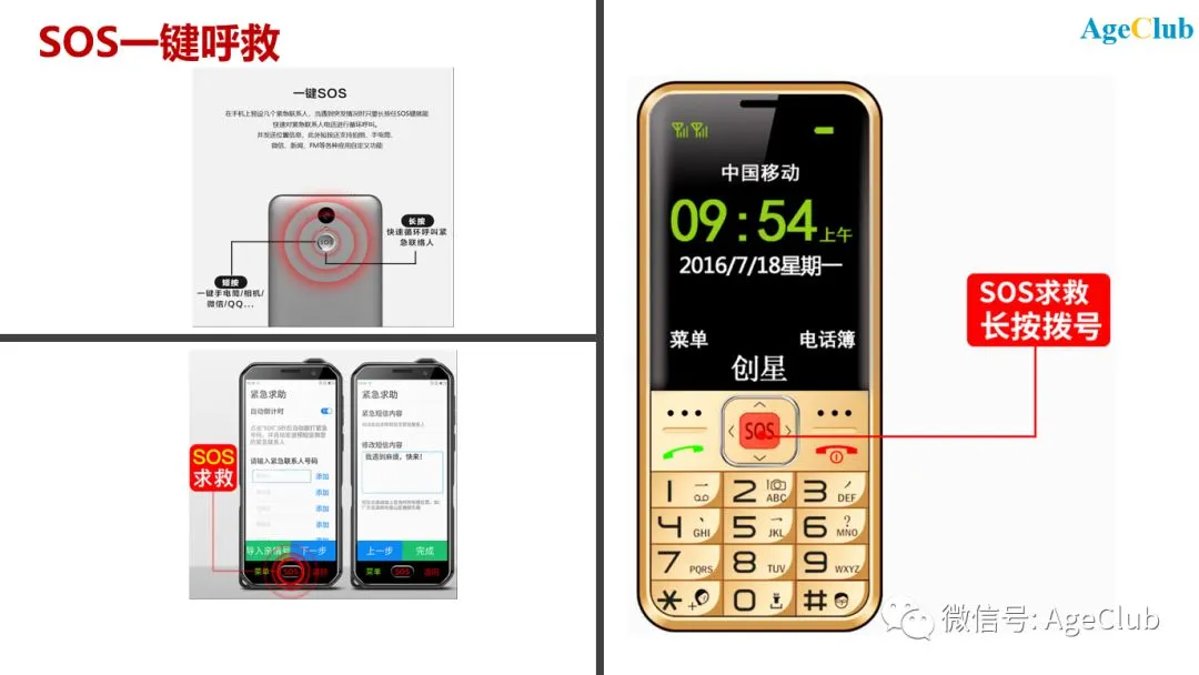 安全性是功能机尤其是专属老年品牌着力的重点,智能机尚属空白。功能机在安全性上主要是SOS一键呼救、紧急情况发出警报呼救。