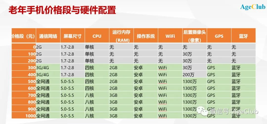 从目前老年手机的价格和配置关系来看,500元以上基本上具备主流智能机所有必备的功能要素,在系统上拥有安卓,在硬件上拥有5寸屏幕、四核CPU、2GB内存、GPS,在连接性上拥有全网通、WIFI、蓝牙等。