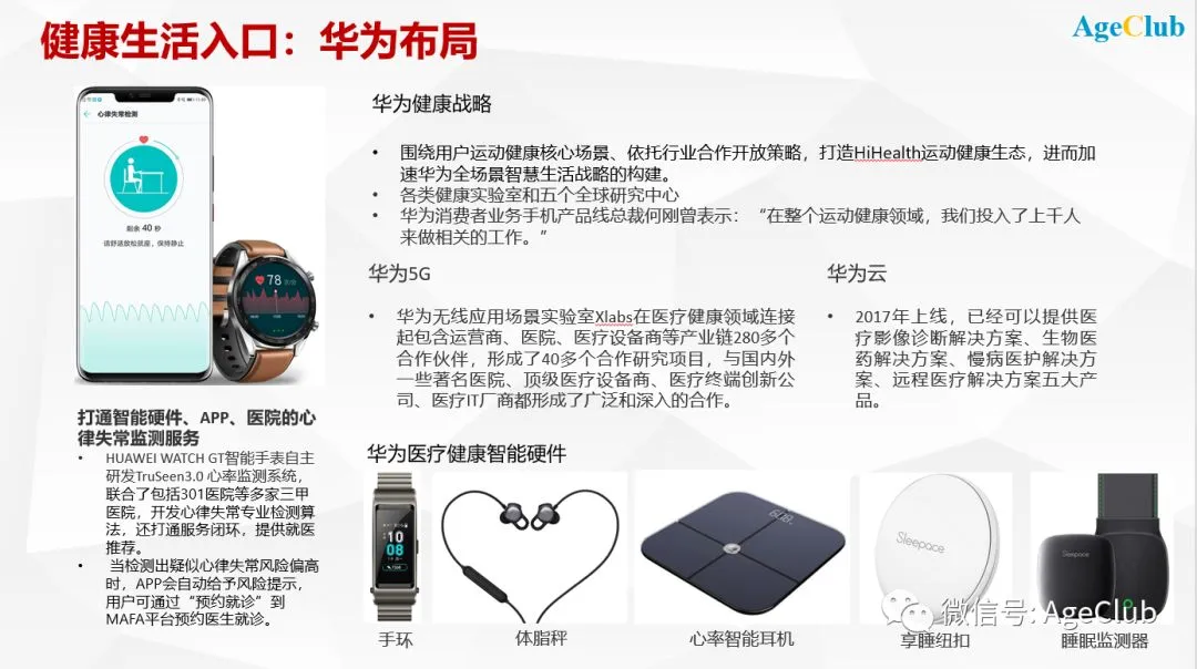华为和小米都是在手机之外布局广泛。华为的特点是自主研发手表、手环、耳机等智能硬件,同时依托云、5G业务与医疗行业建立广泛联系,并已经联合301等顶级医院推出打通硬件、软件、服务的心率失常检测服务。
