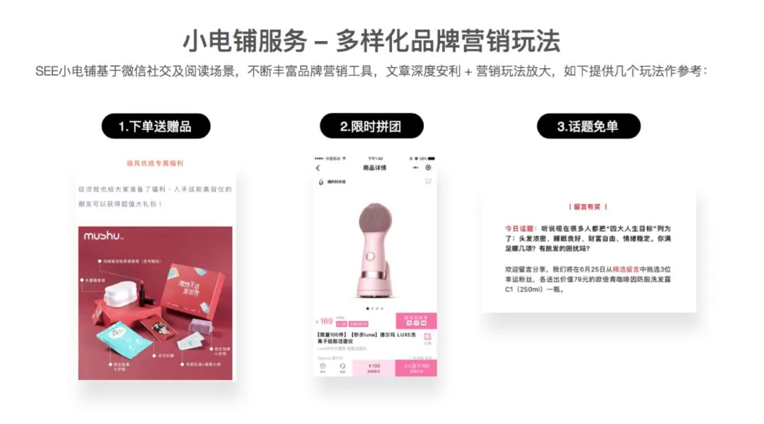 正是依靠庞大的用户量与强大的社交链,微信有着多样化营销玩法的天然环境。小电铺基于微信社交及阅读场景, 不断丰富品牌营销工具, 其“文章深度安利 + 营销玩法放大 ”为商品的销售提供了众多玩法,其中不乏下单送赠品、限时拼团、话题免单等。