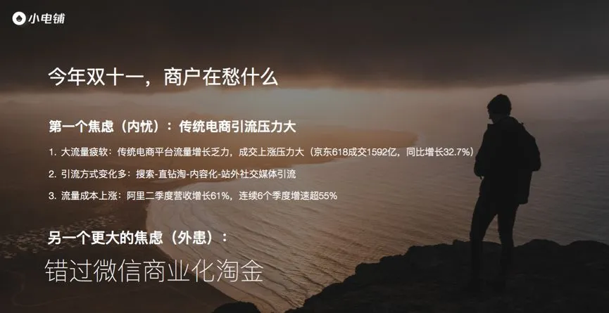 [小电铺]作为社交电商的实践者,已经在微信生态做出许多成功的案例,形成了一套独有的方法论。万旭成认为,目前微信正在从上半场进入下半场,这批数以亿计的用户将释放出新一波势能,这对于创业者、品牌来说是一个良好的机遇。