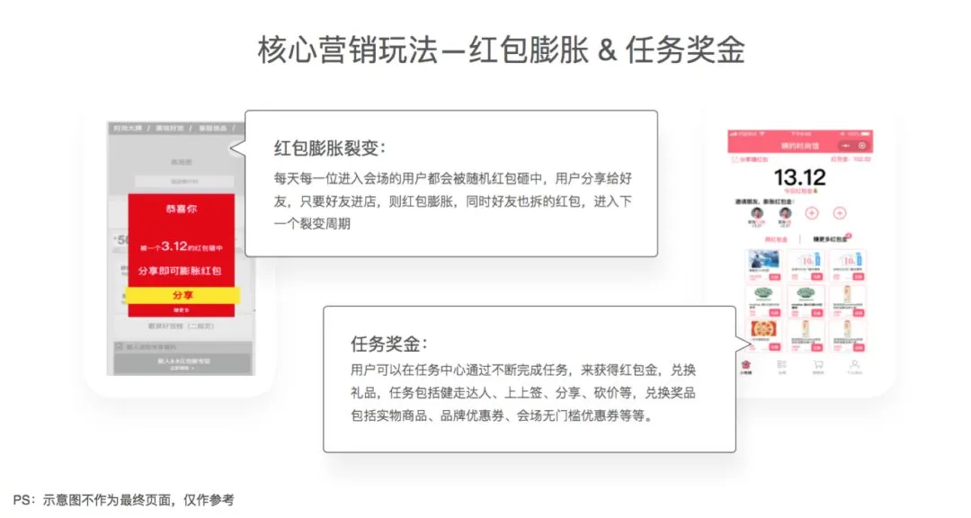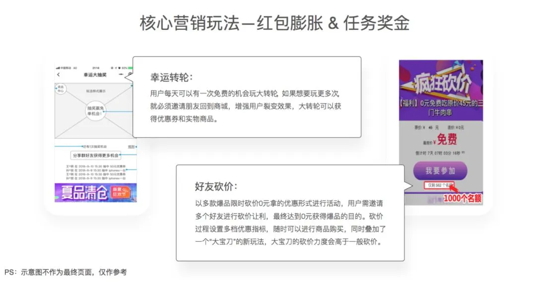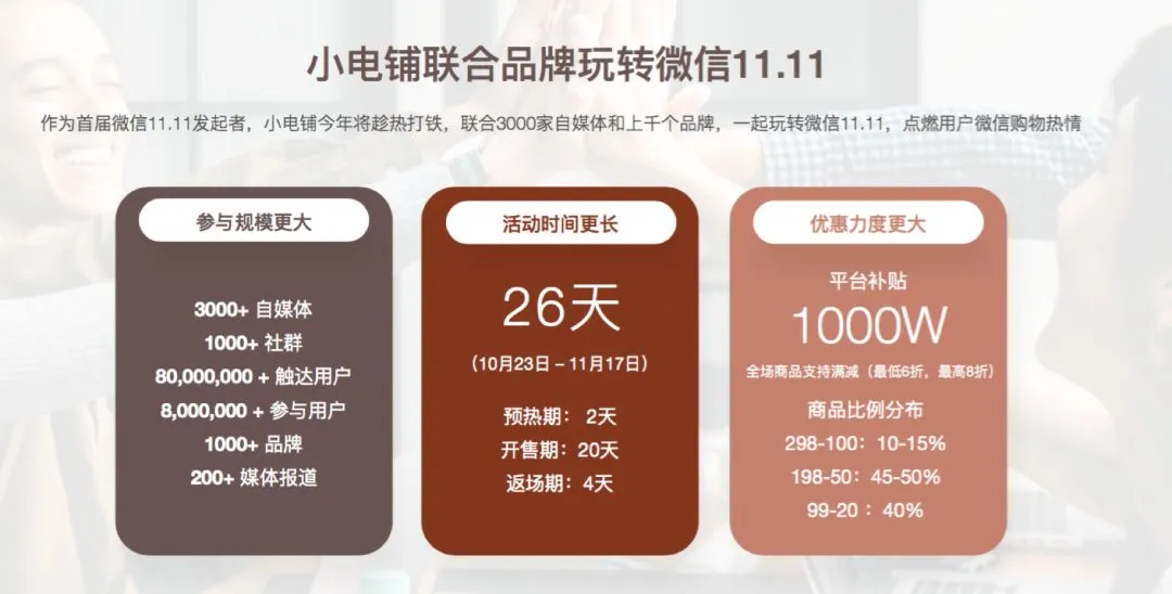 相较于传统的“11.11”,小电铺的微信“11.11”将以“规模”与“折扣”为核心点,联动3000家自媒体与上千个品牌,配置红包裂变、好友砍价、任务奖金、大转轮等众多营销玩法。在玩法上,更有“红包膨胀裂变”与“任务奖金”量大核心营销玩法,(双十一启动时将详细介绍)
