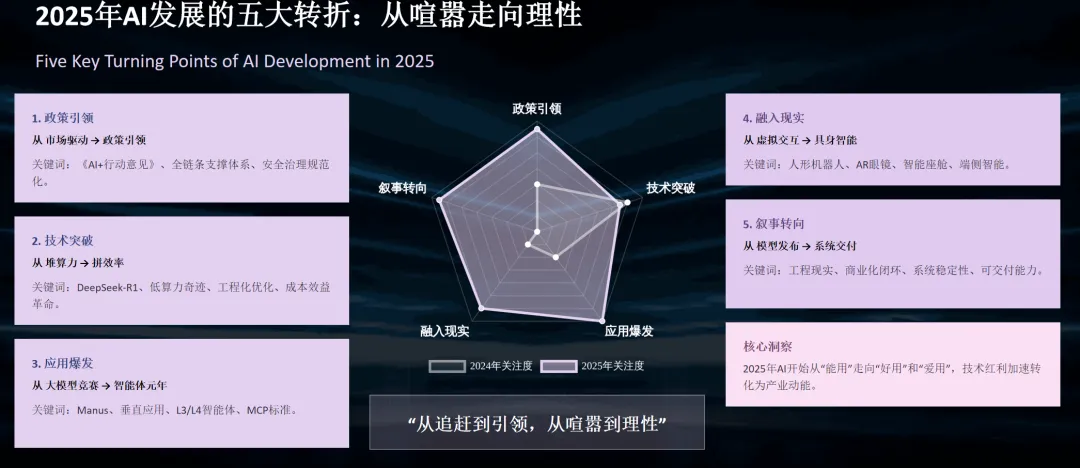 这一年,中国AI技术与产业展现出前所未有的多元图景:基础大模型不再是唯一焦点,取而代之的是各类智能体(Agent)应用的崛起;以DeepSeek为代表的新锐力量在全球舞台上掀起波澜,而传统科技巨头在大模型领域一度陷入“集体失语”,纷纷将目光投向垂直领域应用和合作共赢;此外,AI正从云端走向具身智能,家用机器人、智能眼镜、车载系统等开始融入现实生活。下面,我们将分主题深入剖析2025年中国AI发展的关键趋势与叙事走向。