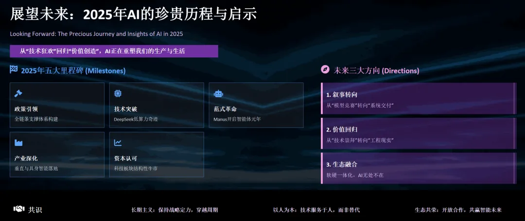 三种叙事在2025年交汇共振,形成了推动中国AI前行的合力。由于官方、企业、群众三股叙事既各具侧重又相互影响,中国AI故事才能呈现出丰富立体的面貌。在这一年里,我们既看到了三方叙事趋于同频共振的时候——全民热议、政策护航、产业高歌猛进。展望未来,这三重叙事有望继续互动演进:在更广泛共识的基础上包容理性声音,在实践中校准预期,以合力推动中国人工智能行稳致远。