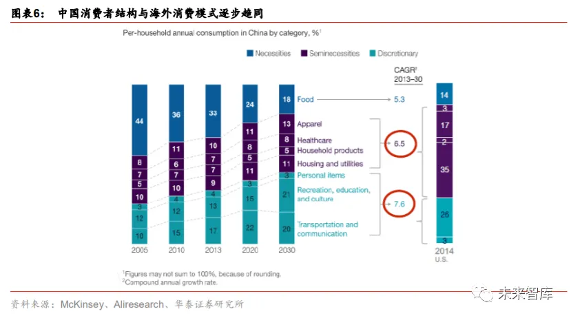 长期看,我国内需消费仍处于品牌化、多样化、个性化、高端化的消费升级阶段。据 2014 年出版的三浦展《第四消费时代》,参照日本四个消费时代的特征,我们认为中国与日本 的第三消费社会阶段类似:一是中国 2018 年人均 GDP(现价美元)与日本 1982 年相当, 处于第三消费时代中期,此阶段人们消费崇尚个性化、多样化、差异化,有明显的品牌倾 向;二是中国 2019 年人口结构与日本 1995 年相似,其中 1965~1975 年出生的人口享受 了改革开放、地产等红利,2015 年开始这部分群体逐渐步入退休期,“有钱有闲”的生活 状态驱动他们消费升级,同时 1995 年后出生的人口继承了财富,年轻的他们更追求个性 化、差异化的消费;三是消费结构持续改善,2013-2019 我国城镇居民与农村居民人均关 于食品烟酒、衣着的支出呈下降态势,尤其是食品烟酒类下降尤为明显。同时,以交通通 信、医疗保健为代表的服务性支出占比不断提高。据麦肯锡预测,2030 年中国家庭去年 在食品上的支出比例将进一步下降,“可选品”与“次必需品”的支出将显著增加,预计 文教娱乐的支出占比超过 20%。