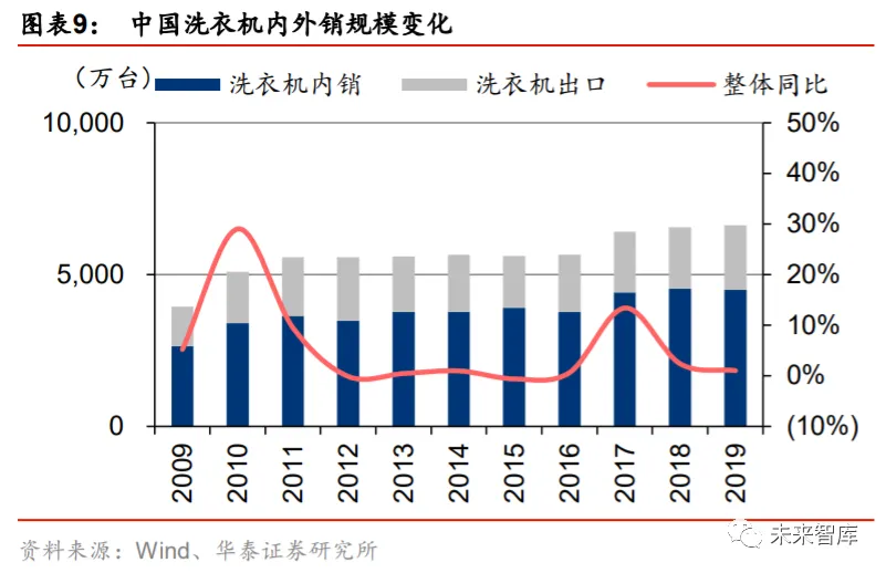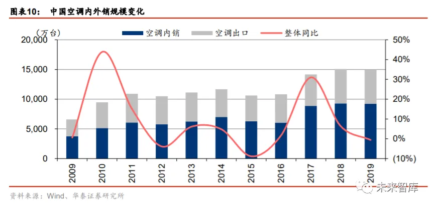 白电产品中,空调内销成长性更优。冰洗产品由于 2009-2012 年期间家电下乡等家电刺激 政策,大幅加速了需求释放,过去几年内销增长都偏弱,主要依托外销市场拉动销售增长。
