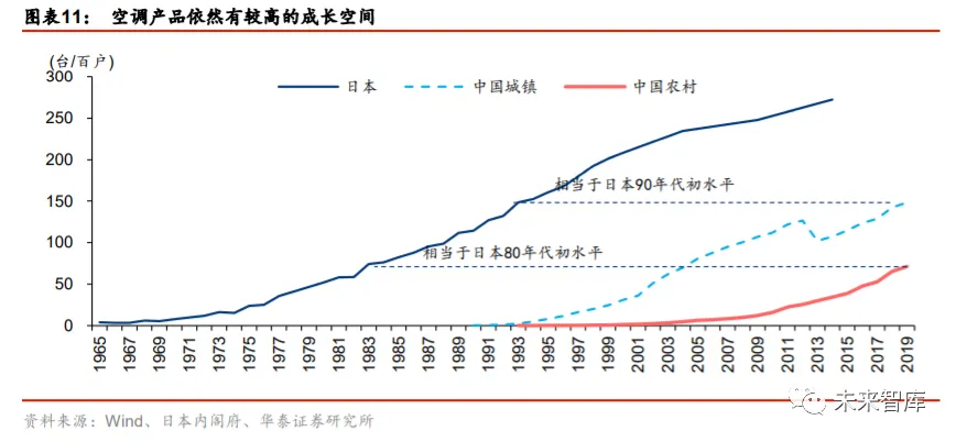 白电产品中,空调保有量仍具备提升空间。冰洗产品保有量在城镇或农村市场都已经进入 高位,未来以更新替代为主,产品升级将主导冰洗产品的发展,在品牌、功能、渠道等方 面拥有优势的企业,更有望挤占更多份额,扩大领先优势。空调产品保有量绝对水平虽较 高,但是对比海外市场,空调保有量增长空间显著,偏双寡头竞争的格局下,空调依然有 望保持较高增速。