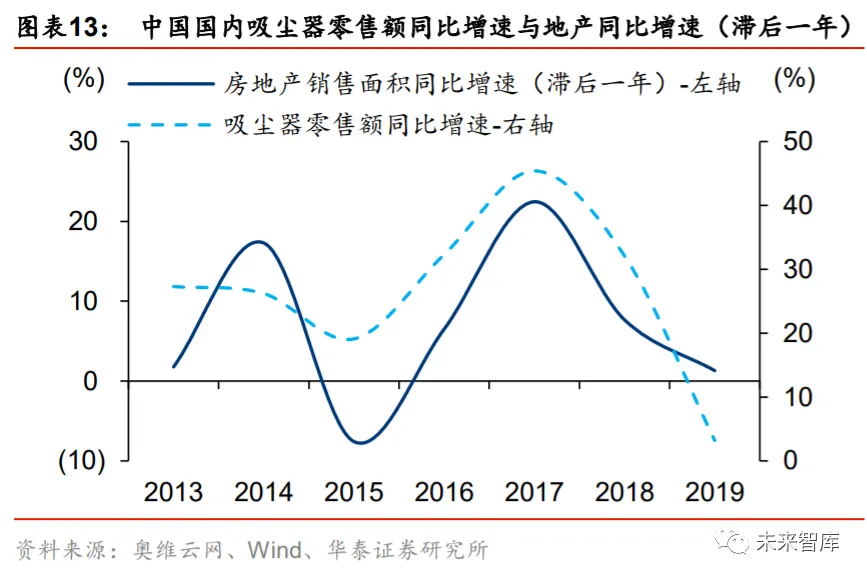 小家电产品呈现出阶段性高增长特点,细分品类持续出现增长机会。以吸尘器产品为例, 2015-2018 年一二线城市的消费升级驱动了吸尘器市场的高速增长,此轮增长后一二线城 市吸尘器渗透率有所提升;另一方面,吸尘器零售量与地产销售滞后数据同步性有所增强, 2016 年以来,国内吸尘器零售量增速与住宅销售面积增速(滞后一年)呈现出明显的同 步波动性。