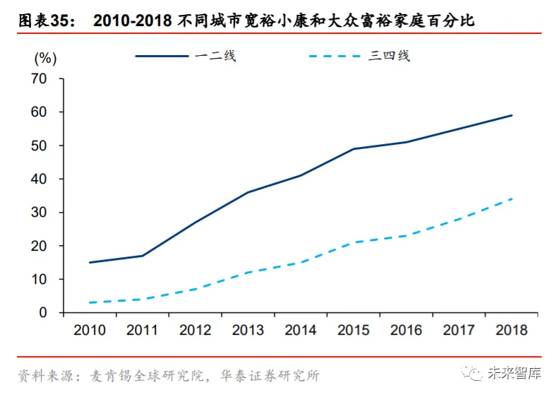 下沉市场红利:下沉市场居民人均可支配收入增速快,富裕消费者显著增加。近年来,代 表下沉市场的低线城市愈发展现出了强大的消费潜力和消费升级的趋势,已经成为了驱动 零售行业发展的重要动力源。在人口数量方面,据第一财经《2019 城市商业魅力排行榜》 显示,全国 338 个城市中,288 个城市属于三线及以下,三线及以下城市人口占中国城市 人口总数的 69.7%。在人均可支配收入方面,低线城市增速表现亮眼,2013-2018 年三四 线城市 CAGR 达到 8.28%,高于一线城市(7.51%)及二线城市(7.7%)。同时,低线城 市中上层中产阶级消费者数量快速增长,2010-2018 年,三四线城市中,年支配收入达 14~30 万元的家庭数量年复合增长率达 38%,高于一二线城市的 23%。2018 年这些较富 裕家庭占三四线城市人口的 34%,接近 2013 年高线城市的水平。