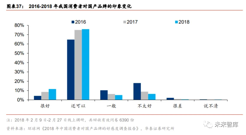 国货品牌崛起:创新驱动中国品牌持续高质量发展,居民文化认同感提升为国货带来发展 良机。据阿里研究院,2019 年中国手机、服装、家具、箱包服饰、运动户外、建筑装潢 等行业品牌不断推出新品,新品销售额占品牌增量大幅提升。通过不断的高品质创新,中 国品牌逐步改变人们对其的刻板印象。据环球网《2018 年中国消费者对国产品牌的好感 度调查报告》,2016-2018 年我国消费者对国产品牌的整体印象呈提升趋势。伴随我国新 中产阶级崛起,居民文化认同感提升,国货品牌迎来发展良机。