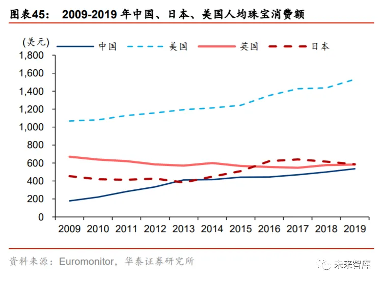 我国人均珠宝消费相较美国仍有较大提升空间。据 Euromonitor,2019 年中国人均珠宝消 费额达到 535.9 美元,与美国的 1531.0 美元存在较大差距。我们认为随着经济增速逐步 修复,居民可选消费压力缓解,黄金珠宝人均消费额存在进一步提升空间。根据 Euromonitor 预测,2019-2024E 我国珠宝首饰市场将保持每年 6.7%左右的同比增速。