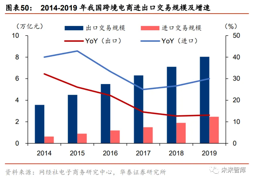 2019 年我国跨境电商行业交易规模突破 10 万亿元,从货物流通方向看以出口为主。我国跨 境电商行业持续快速发展,行业渗透率不断提升,2014-2019 年,跨境电商行业市场规模 CAGR 达 20.1%。2019 年行业交易规模达 10.5 万亿元,同比增长 16.7%,其中出口交易规 模达 8.0 万亿元,占比约 76.5%,是跨境电商的主要组成部分。