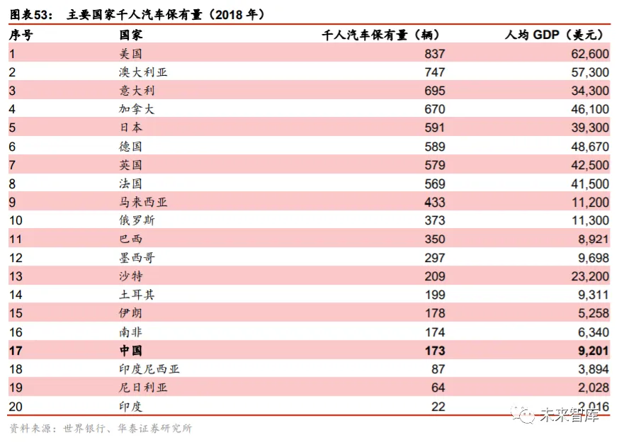 按 2019 年新车销量计算,中国已经是全球第一大汽车市场。然而从汽车千人保有量和渗 透率来说,我国汽车市场还有很大的提升空间。截至 2018 年底,国内汽车(含乘用车和 商用车)保有量 2.4 亿辆,千人保有量 173 辆,比发达国家 500 辆以上的水平还有较大的 发展空间。比如美国、澳大利亚、日本、德国 2018 年千人汽车保有量分别为 837 辆、747 辆、591 辆、589 辆。跟与中国人均 GDP 接近的发展中国家相比,中国的千人汽车保有 量也处于较低水平。2018 年中国人均 GDP 为 9,201 美元,与马来西亚、俄罗斯、巴西、 墨西哥等国家接近,但这四个国家的千人汽车保有量分别为 433 辆、373 辆、350 辆、297 辆。我们认为,随着宏观经济的发展和人均可支配收入的逐步增长,国内汽车保有量有望 进一步增长。