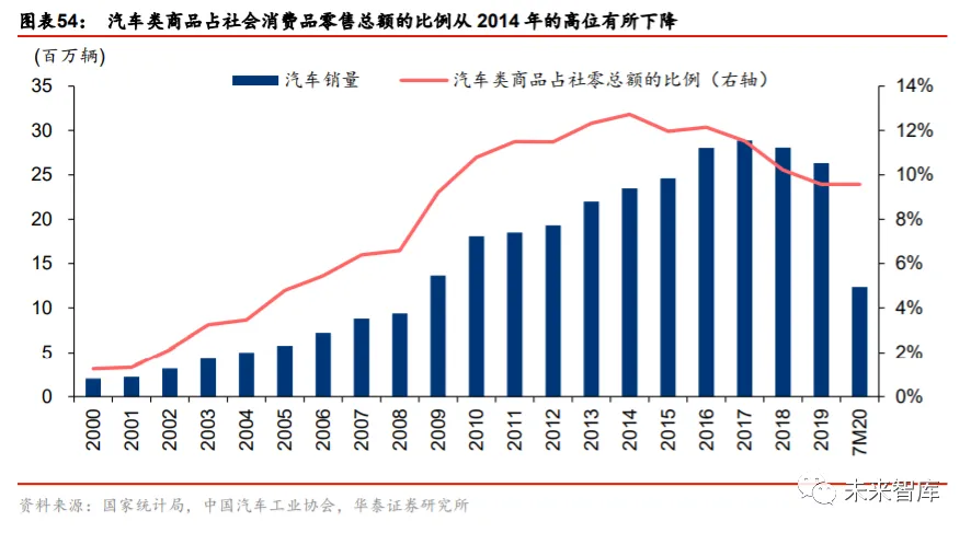 汽车消费是国内社会消费品零售中较大的一个品牌,2019 年金额占比为 9.6%,较 2014 年的 12.7%有明显的下滑。随着中国经济增长从以前的基建、出口驱动为主,逐步转变为 消费和内需驱动,汽车消费有望成为政策发力的杠杆。过去几年,各级政府也在不断优化 政策环境,鼓励汽车消费,相关措施包括 1)通过免新车购置税、提供购车补贴等方式鼓 励新能源汽车消费;2)部分汽车限购城市增加牌照供应;3)鼓励汽车和新能源汽车下乡;4)放开皮卡进城限制;5)部分省市为消费者购买新车提供现金补贴;6)逐步破除国内 二手车在不同省份之间的迁移限制;7)出台具体政策,鼓励二手车出口等。总体而言, 随着国内经济逐步企稳,政策环境逐步优化,汽车消费将迎来更好的经济和政策环境。